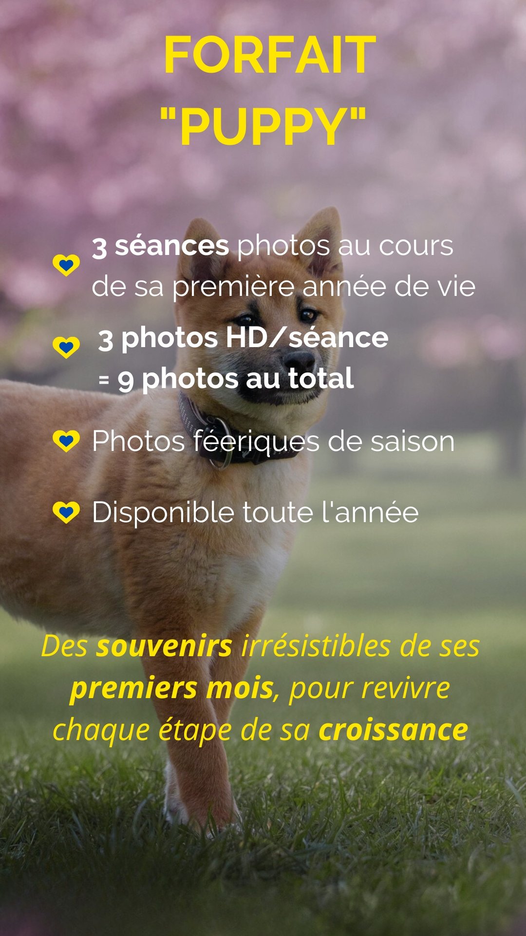 Offrez à votre petit compagnon le forfait « Puppy » pour immortaliser ses précieuses premières étapes de vie !